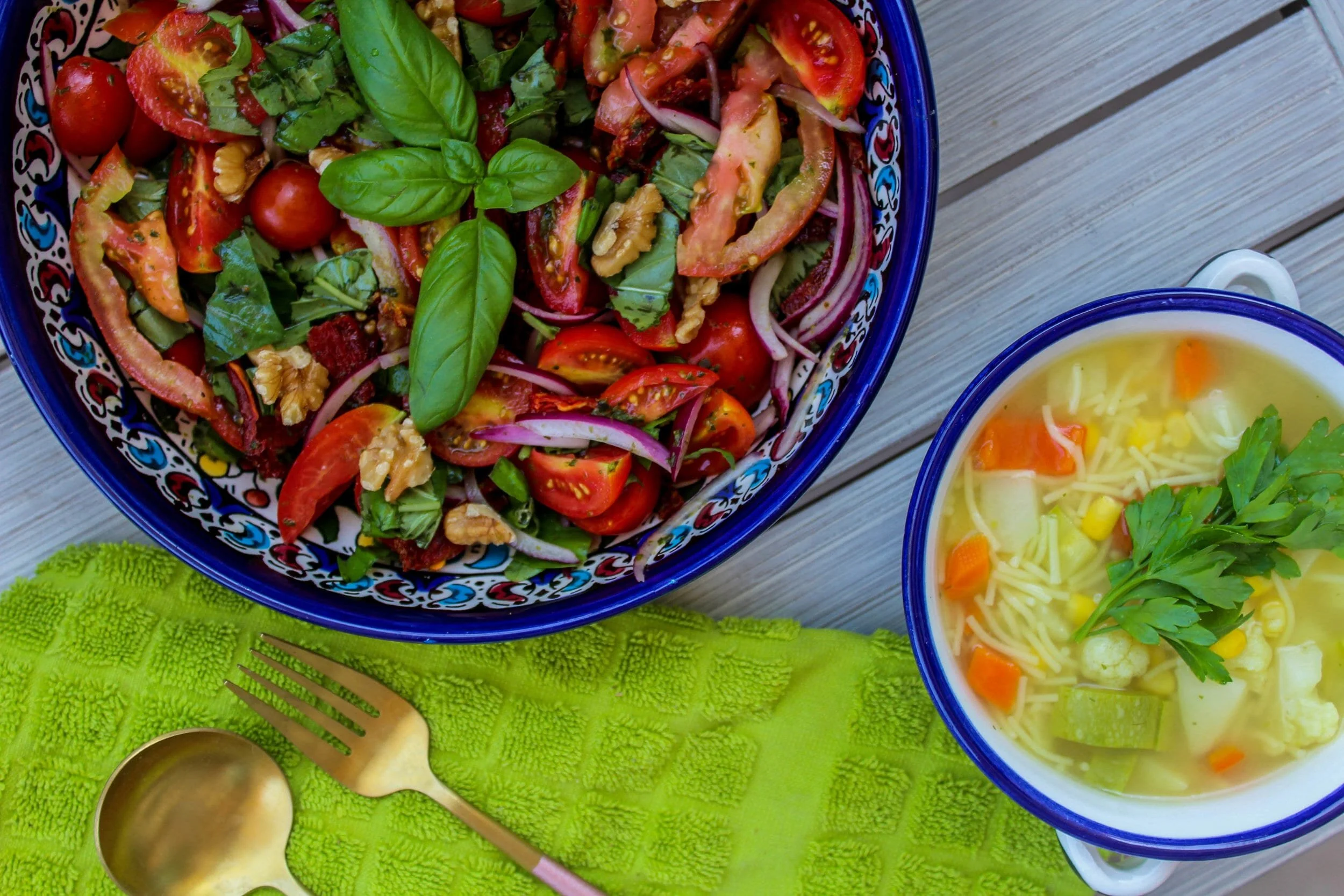 رجعت لفلسطين وأخيراً صار بإمكاني أزرع أعشابي الخاصة وأستمتع فيهم بسلطة. وقررت أبدأ بواحد من أعشابي المفضلة وهو الريحان. الريحان من الأعشاب الرائعة لأنها بتتميز بنكهتها المختلفة وإلي بتحتاج سلطة بسيطة. وشو أكثر مكون مناسب مع الريحان؟ الإيطاليين الرائعيين دائماً عرفوا أنها البندورة. كان عندي أكثر من نوع بندورة محلي وبندورة مجففة من إسطنبول فقررت تكون سلطة بندورة وريحان بسيطة. التزمت بالنكهات الإيطالية وحضرت تتبيلة بالبيستو والليمون، واللمسة الأخيرة هي الجوز. بسيطة بس كلها نكهات! استمتعوا فيها مع شوربة خضار كوجبة غدا خفيفة أو استخدموا الباقي مع خبز ريفي ولبنة لفكرة مقبلات لذيذة. صحة وهنا!