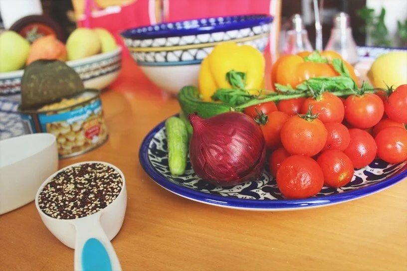 Cut small. That's how Palestinians like to do things: simple, clean, and bold. And I like to add chickpeas with everything because why not? Now for the boost: Quinoa! Garnish with the ultimate garnish- SUMAC.
